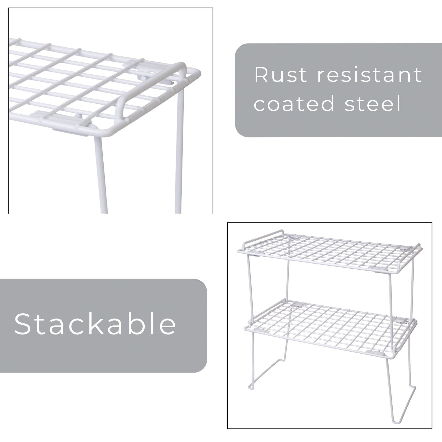FEATURES - With a stackable, sturdy steel frame that's ideal for organizing plates, cups, and spices
