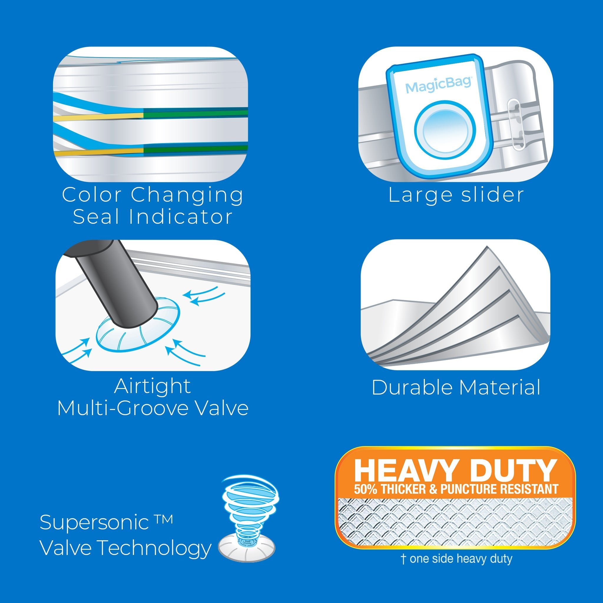 • Easy-grip slider for quick sealing. Slide back and forth several times to ensure a proper seal