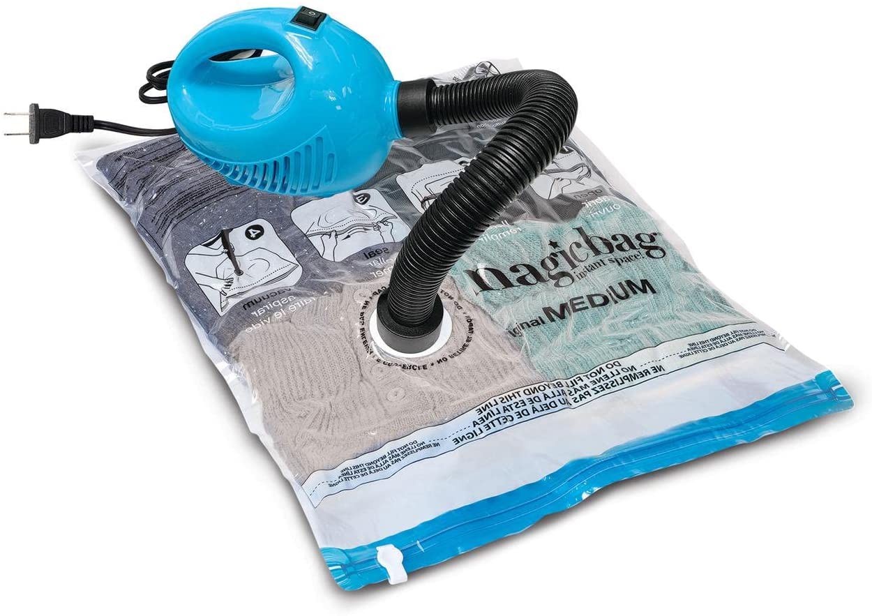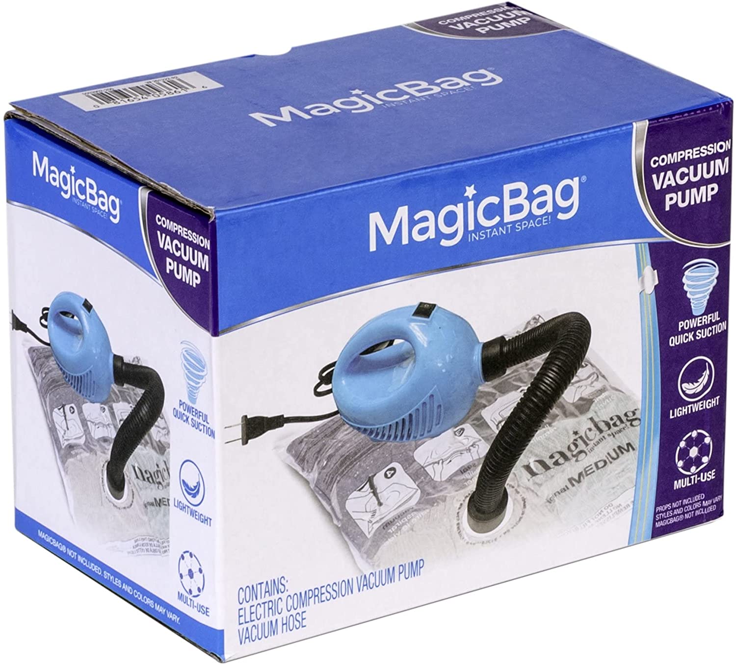 The MagicBag® Compression Vacuum Pump makes compressing storage bags fast, simple, and effortless. Portable, lightweight, and powerful, this compact device quickly removes air from MagicBags and most other vacuum compression bags, helping you maximize storage space in closets, garages, basements, and travel situations. Designed with an 11-inch hose and easy-grip handle, it delivers reliable suction with minimal effort.